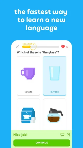 Главный подход Duolingo — обучать через лёгкие задания и мини-игры, чтобы было интересно и чтобы слова запоминались быстрее. Приложение предлагает разные темы, и каждая тема включает наиболее употребляемую лексику. Освоив слова, пользователь может пройти мини-игры и повторить материал.