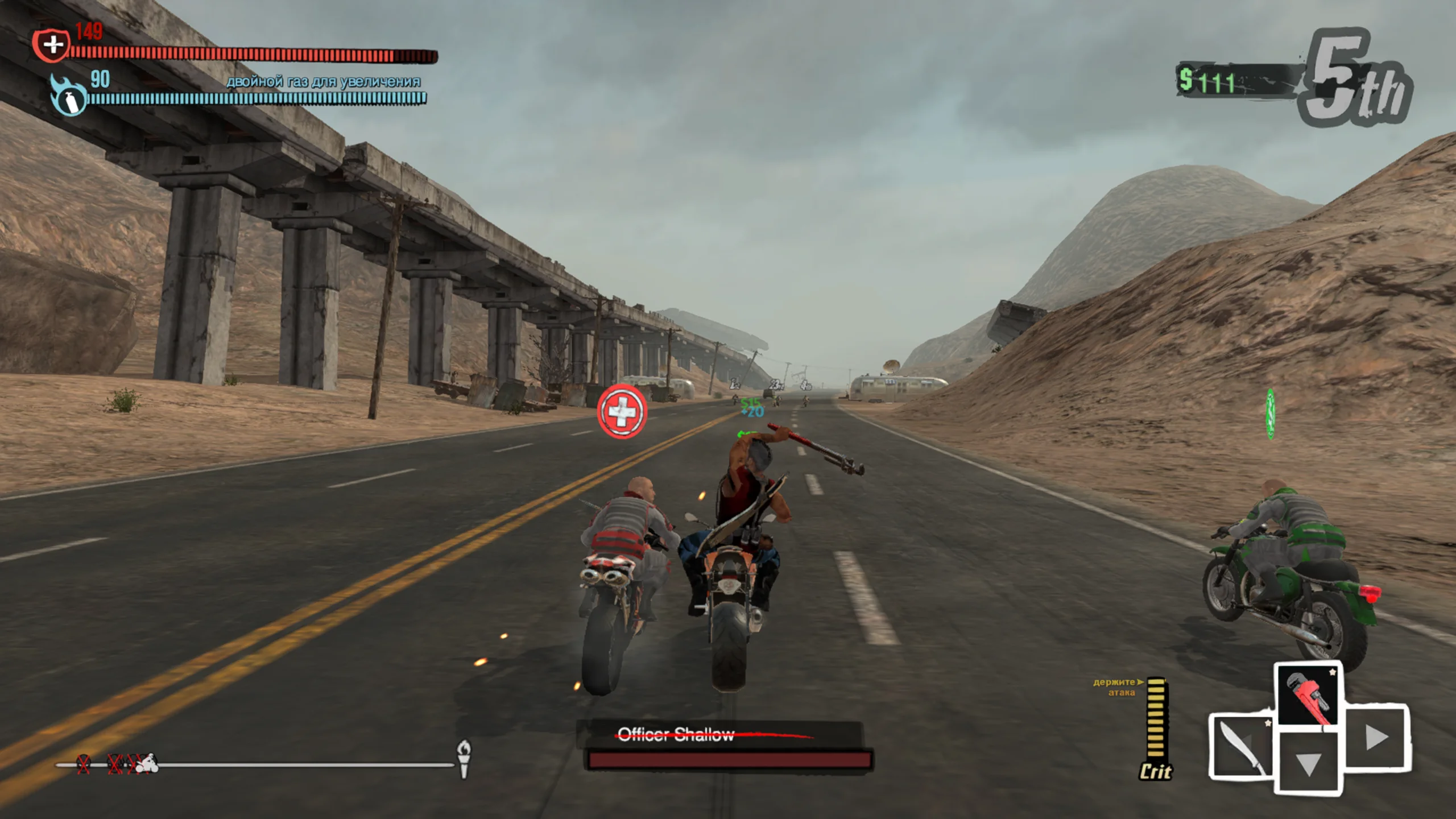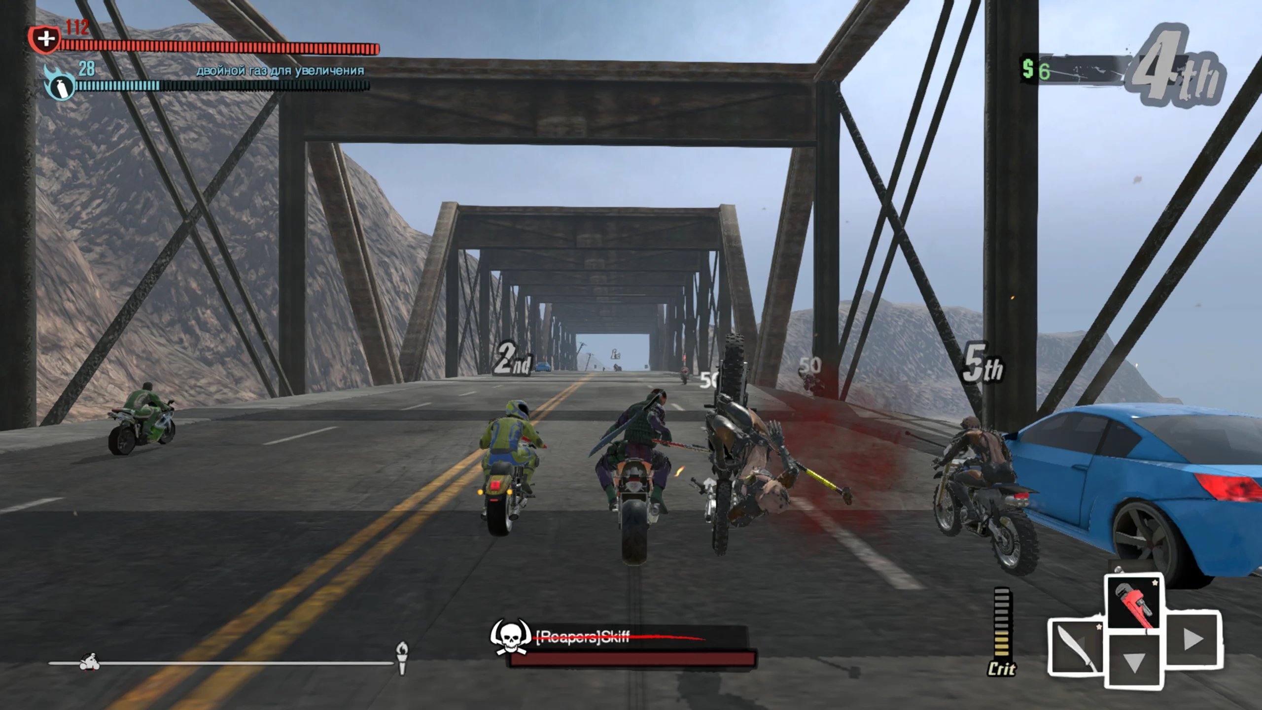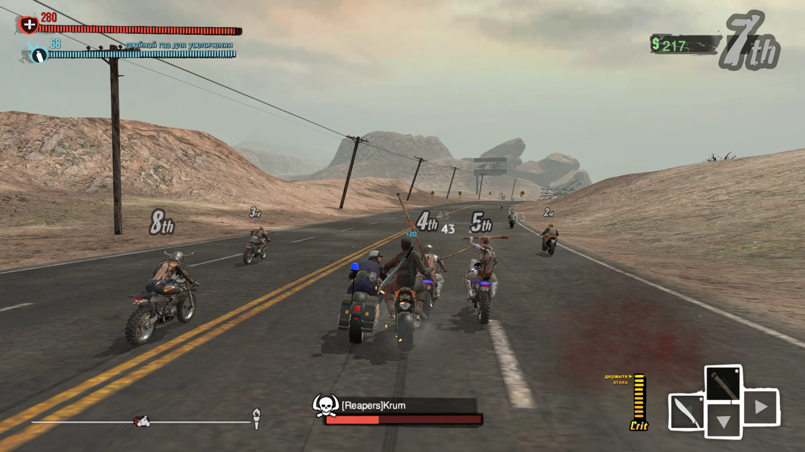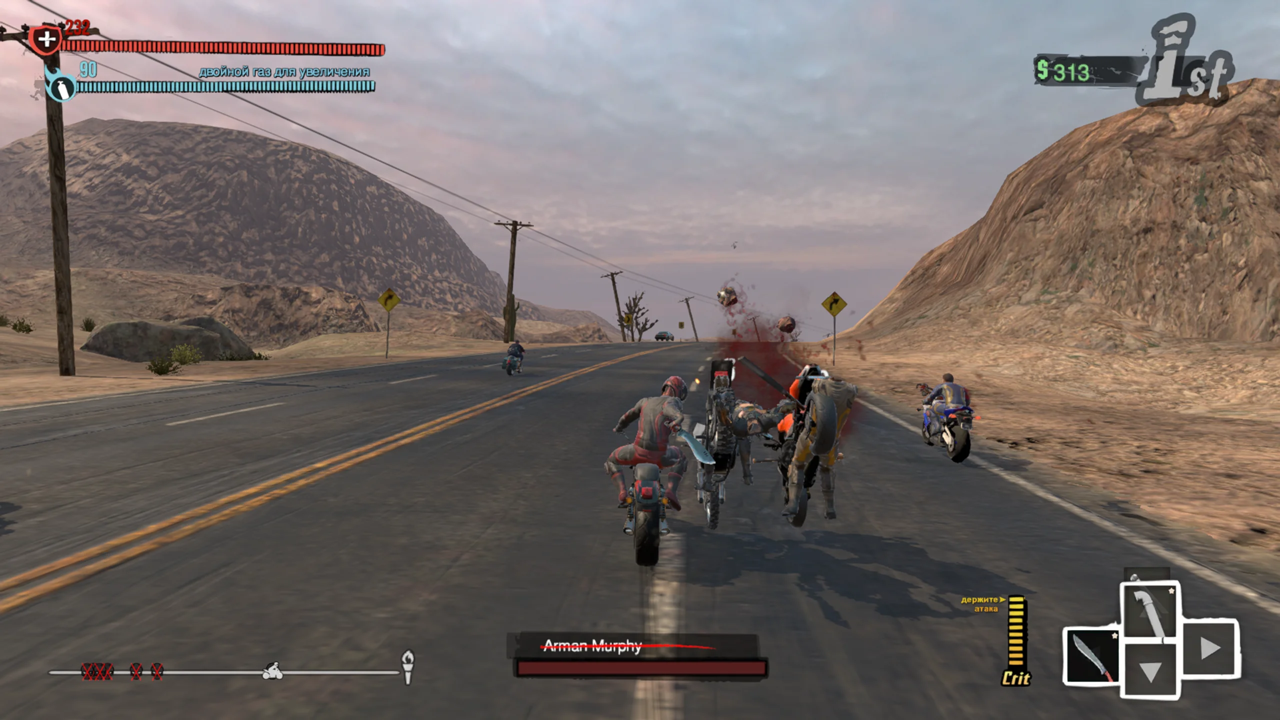 Road Redemption — аркадная гонка с акцентом на боевые столкновения на мотоциклах. Игру создали студии Redemption Road Games (известная как Pixel Dash Studios) и EQ-Games, издателем выступила Tripwire Interactive. Версия для Nintendo Switch вышла 6 ноября 2018 года. Проект сочетает дух классической Road Rash с современной графикой и обновлёнными игровыми системами, разворачиваясь в постапокалиптическом мире. Сюжет переносит в опустошённую страну после глобальной войны, где мотобанды делят власть на разрушенных трассах. Отправной точкой служит убийство главаря влиятельного оружейного картеля безымянным байкером-киллером, за которого назначена крупная награда. Игрок берёт роль преследователя или наёмника, прокладывая путь через земли союзных и враждебных кланов, чтобы настичь цель или самому стать легендой скорости и силы. Геймплей совмещает скоростные заезды с рукопашными и вооружёнными схватками прямо на трассе. Участвуя в гонках, заданиях и рейдах, игрок улучшает персонажа, мотоцикл и набор оружия. Боевая система предлагает удары, захваты, контратаки, критические приёмы и арсенал ближнего и дальнего боя — от мечей и бит до дробовиков и самодельных взрывчаток. Смерть не обнуляет прогресс: полученный опыт сохраняется для следующих попыток. На Nintendo Switch доступна кооперативная игра на одном экране для двоих. Визуально игра выполнена в стилизованной 3D-манере с мрачной постапокалиптической атмосферой, сочетающей мотивы Road Rash и отсылки к эстетике «Безумного Макса». Трассы ведут через пустоши, полуразрушенные города и опасные участки дорог. Саундтрек и эффекты подчёркивают напряжённый, хаотичный характер гонок, усиливая чувство скорости и постоянной угрозы. Критика встретила Road Redemption сдержанно-положительно: хвалили динамичный экшен и наследие Road Rash, но отмечали отдельные недочёты в управлении и технической части на разных платформах. В целом игру тепло приняли поклонники боевых гонок.